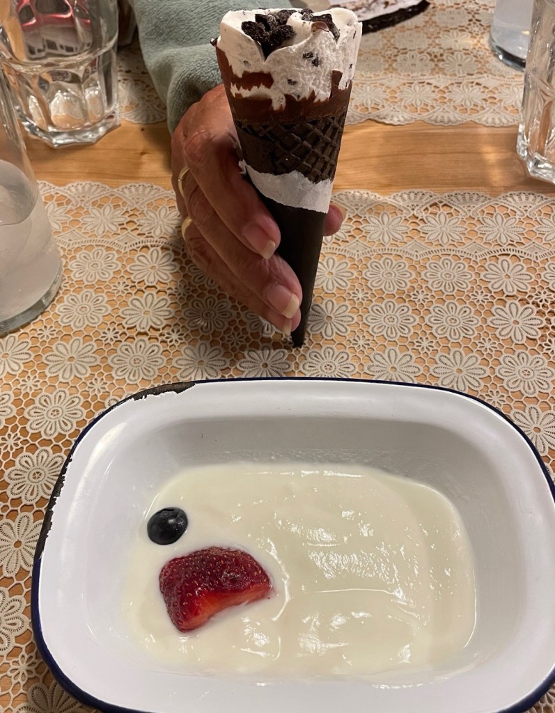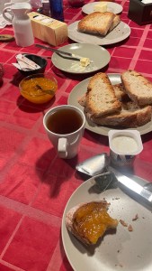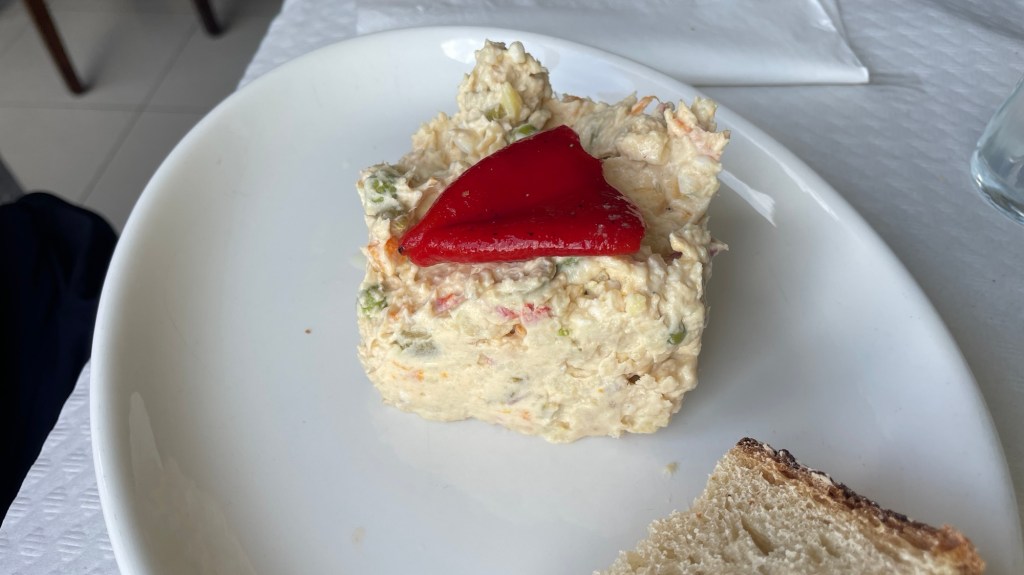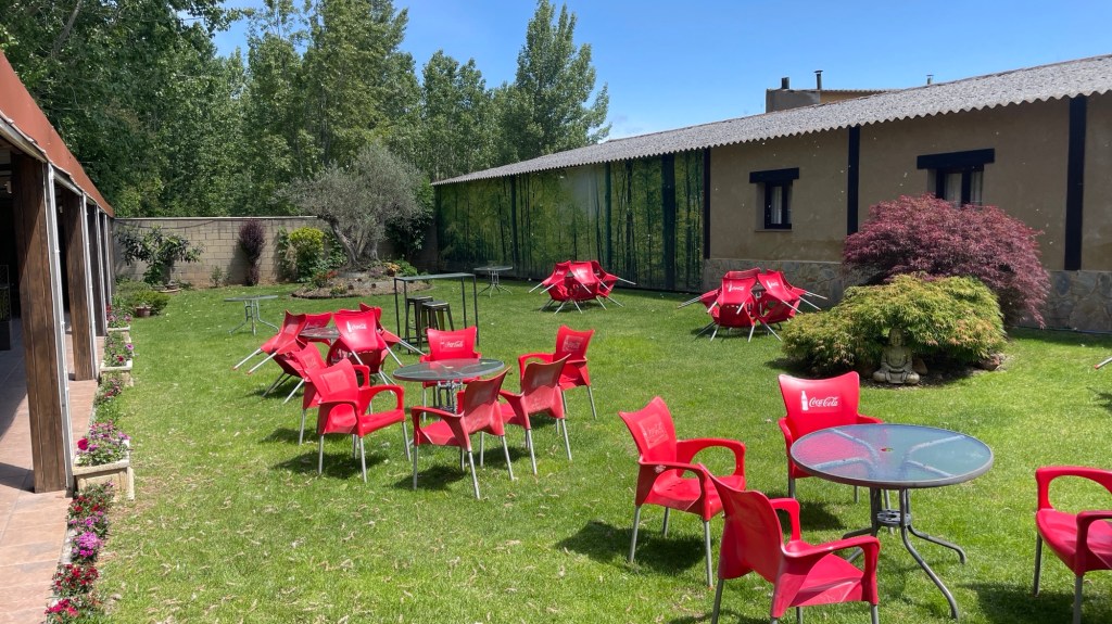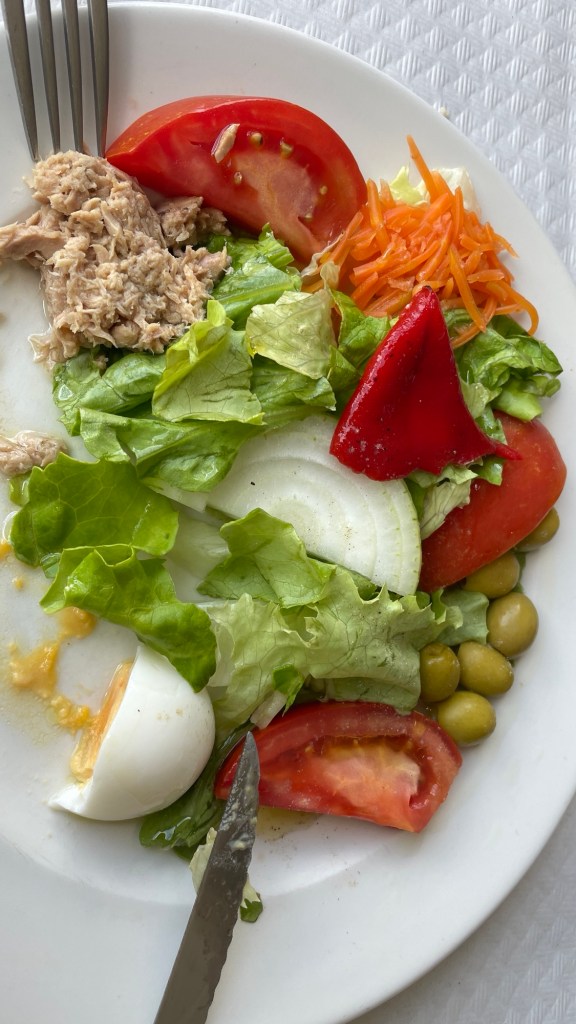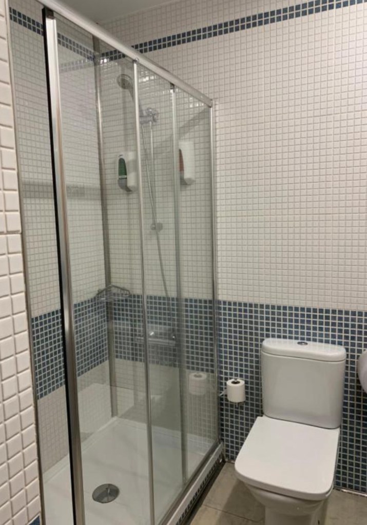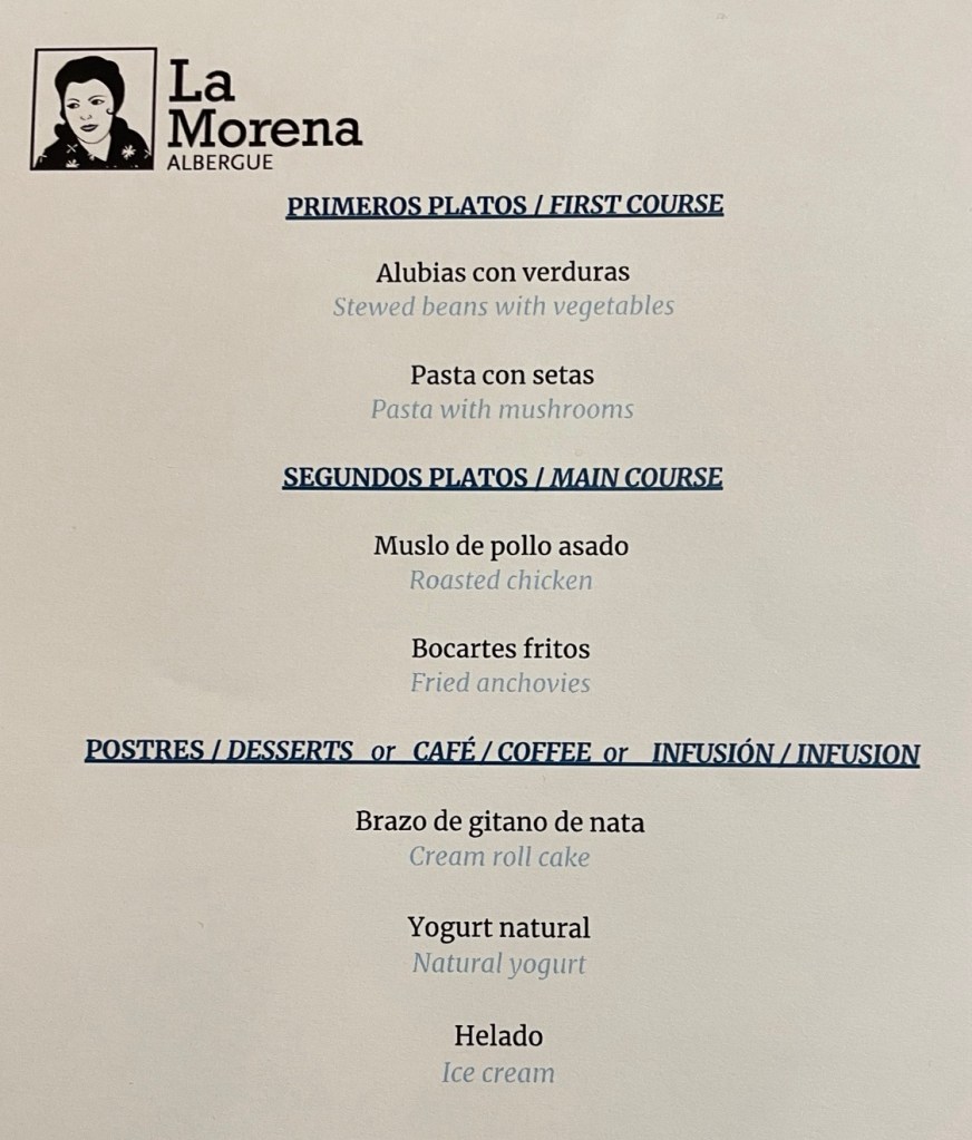 Om 08:00 uur namen we, voor de Camino van dit jaar toch, een zeer uitgebreid ontbijt: één sandwich, twee kleine croissantjes, een sneetje cake, vier sneetjes iberico ham, jam, honing en koffie of thee. We hebben alles opgegeten!
